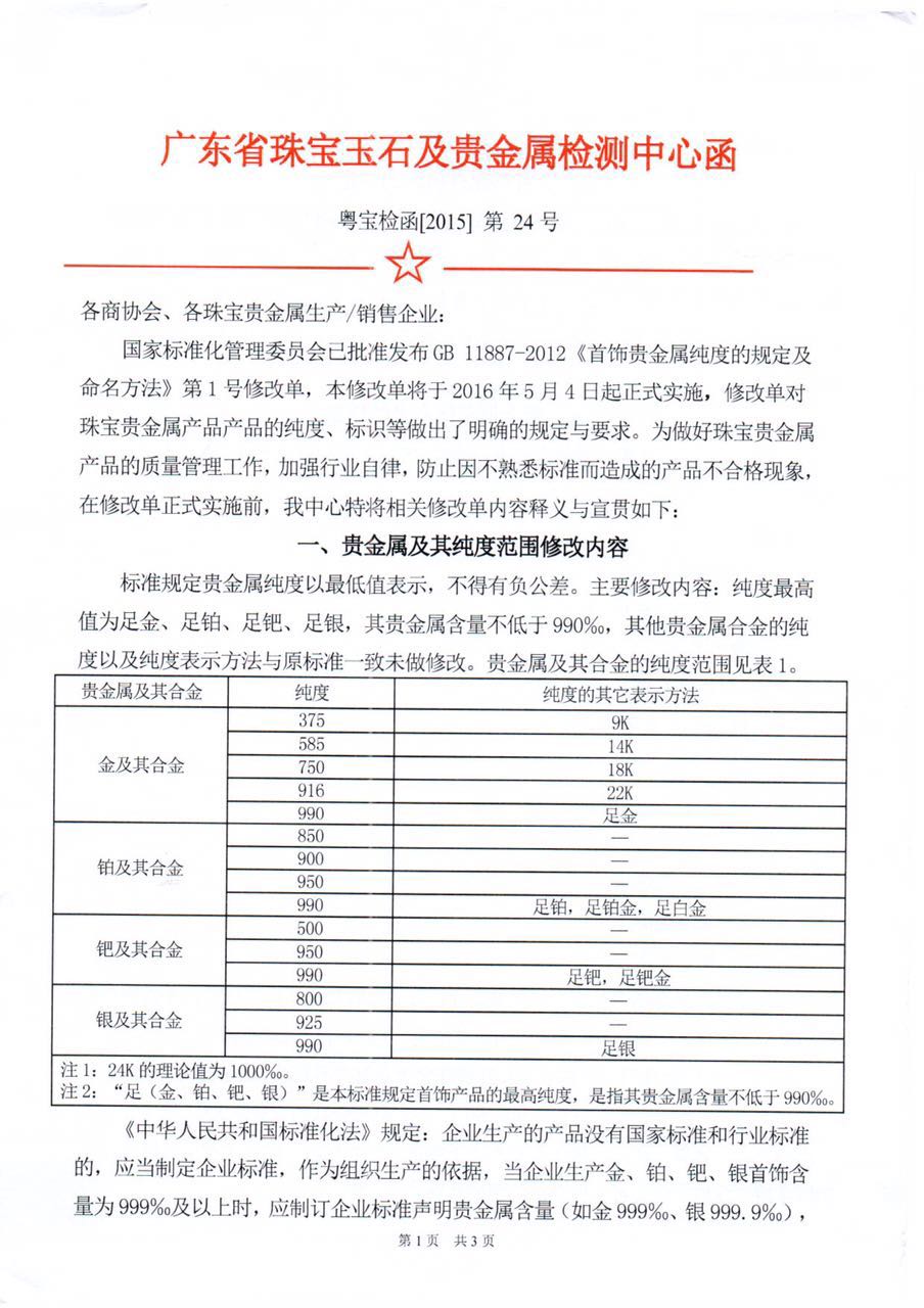 国家标准化管理委员会已批准发布GB 11887-2012《首饰贵金属纯度的规定及命名方法》第1号修改单,本修改单将于2016年5月4日起正式实施,修改单对珠宝贵金属产品的纯度、标识等做出了明确的规定与要求。为做好珠宝贵金属产品的质量管理工作,加强行业自律,防止因不熟悉标准而造成的产品不合格现象,在修改单正式实施前,我中心特将相关修改单内容释义与宣贯如下: